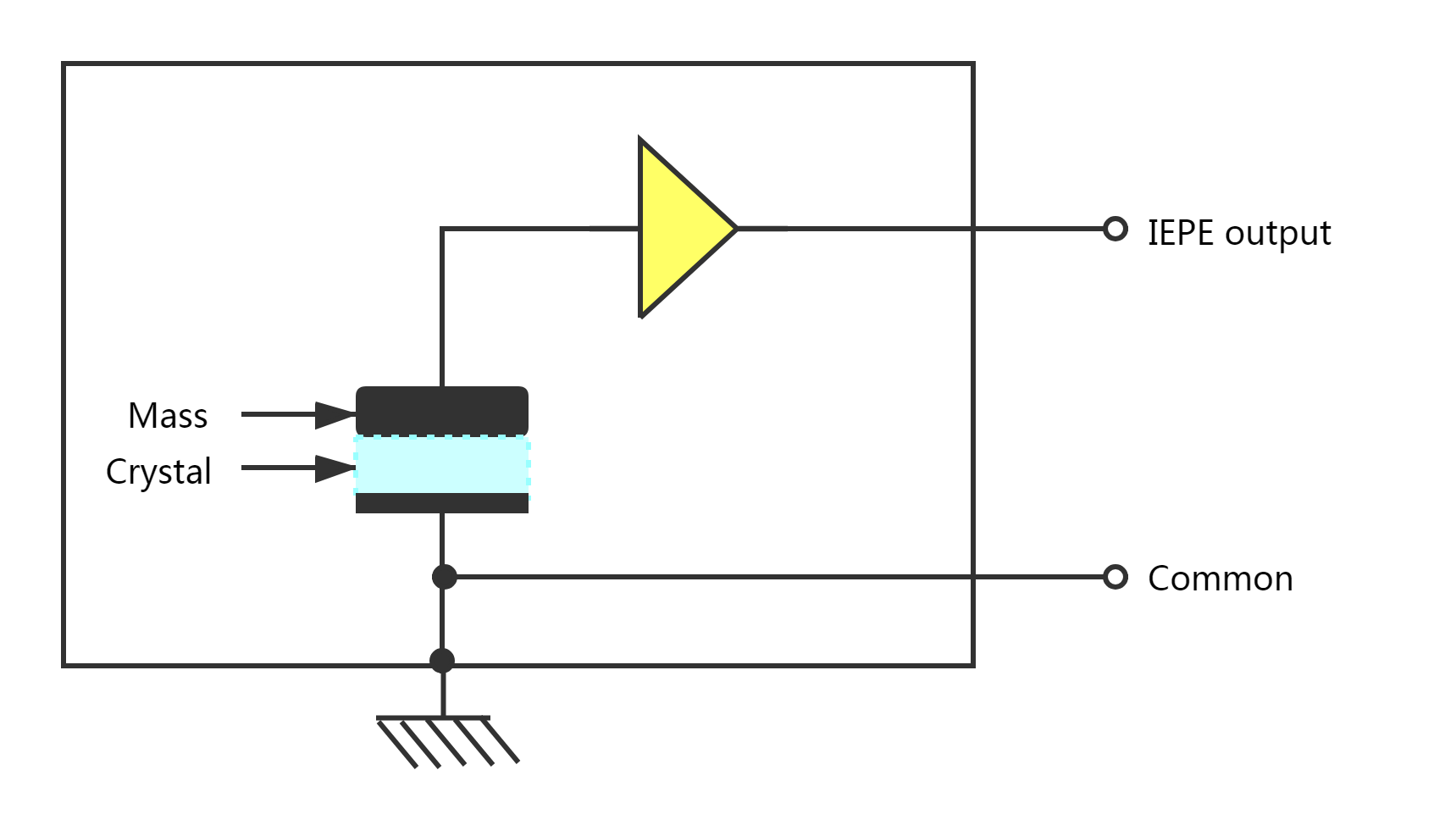 如图1所示,压电晶体的一侧(下侧)连接到外壳,而另一侧(上侧)连接到质量块。该晶体的电荷输出在内部被连接到电荷放大器的输入。电荷放大器的输出通过连接器被引出,并作为加速度传感器的输出。电阻测量可用的线是IEPE输出线和信号返回线(也被称为公共线)。