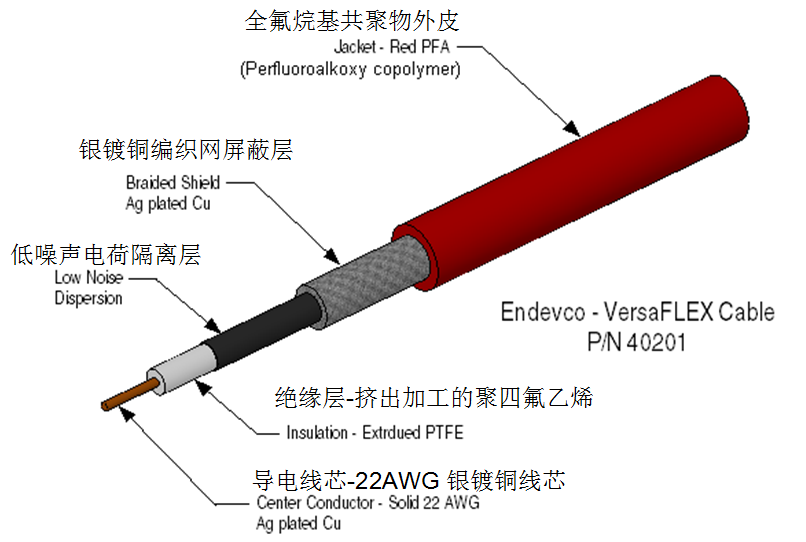 电噪声电荷和标准电缆的最本质的区别是低噪声电缆的绝缘层加上一层特殊的导电层(见上图的“低噪声电荷隔离层”)。导电层大大减小了由于电缆运动导致的屏蔽层与中心导体摩擦产生的静电。