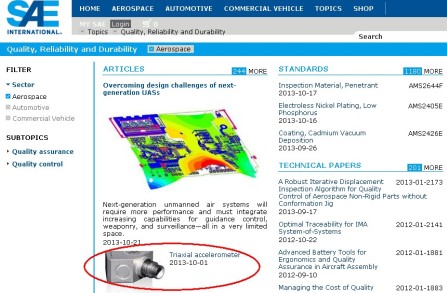在SAE官网的航空航天栏目中,就为全球的汽车/航空航天工程师推荐了美国Endevco(恩德福克)的新产品7253D三轴加速度传感器。
